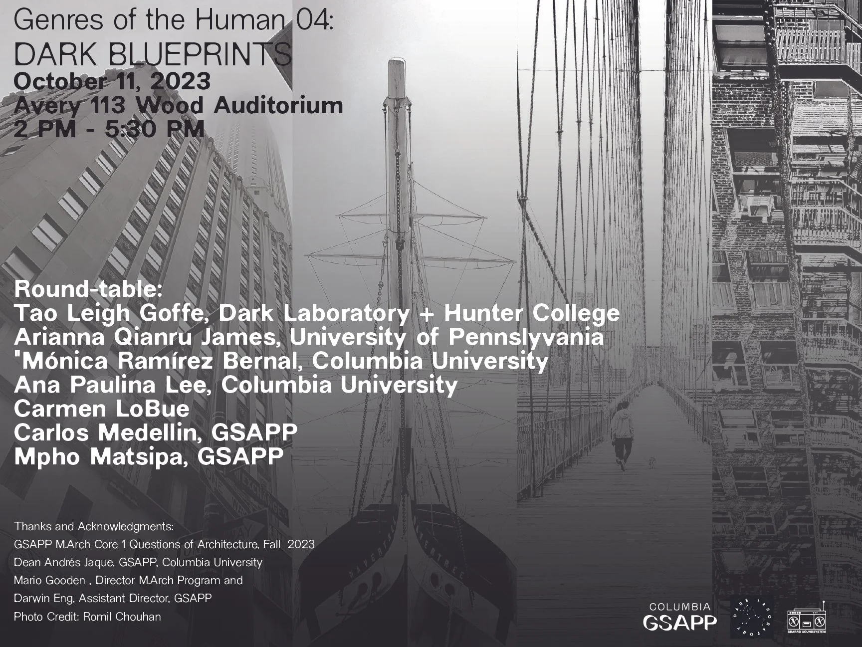 Columbia Architecture and Professor Mpho Matsipa invited the Dark Laboratory and Professor Tao Leigh Goffe to activate an afternoon of multi-sensorial experiences as part of the course “Questions of Architecture, Form and Representation.” Dark Lab responded by expanding on Dark Blueprints as a concept explored in the academic article “Dirge: Black and Indigenous Hemispheric Burial.” Celebrating the duality of Indigenous Peoples’ Day in the context of Black Lives Matter, participants will create new critical blueprints for spatial knowledge that activates the senses of taste and hearing.